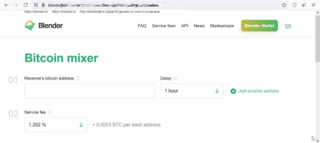 Figure 13. Screenshot of Bitcoin Mixing Service Blender on the Onion Router (Commonly Known as Tor) (Source: Blender [22]).
